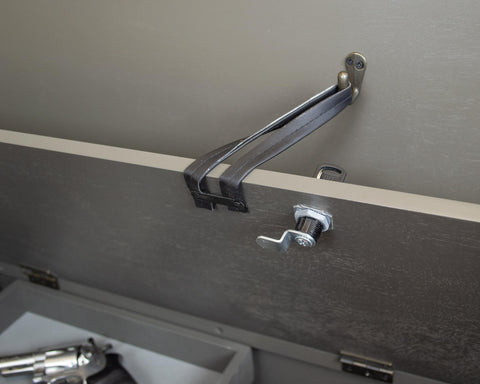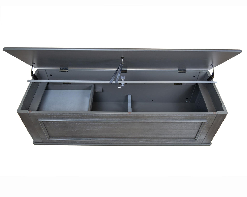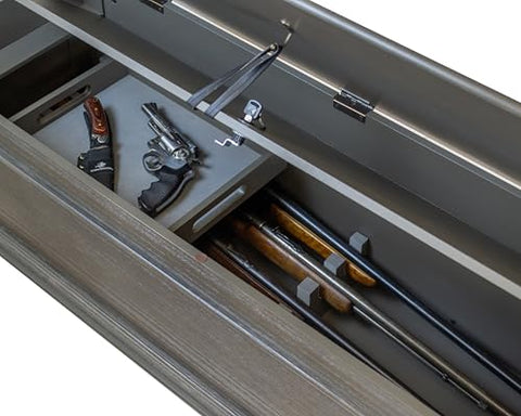 Timeless wood styling meets secure storage in a mountain-grey bench that hides a locking compartment for up to five long guns, plus a removable tray for accessories. Padded rests protect finishes, and the upper area has room for blankets and daily essentials. This is concealment furniture that blends with living spaces and bedrooms while supporting responsible storage. Searches like locking gun bench, concealed long gun storage, and gun concealment furniture fit perfectly. A substantial Christmas gift for responsible owners.