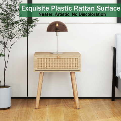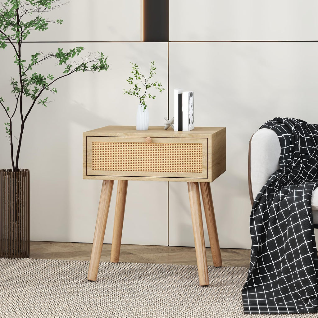 Warm rattan mesh and solid wood legs bring breezy style to this bedside table, while a press-to-open hidden drawer protects private items. The roomy top and woven drawer handle nightly essentials, and the compact footprint fits beside sofas or beds. Clean surfaces wipe down easily for low-maintenance living. Searches include rattan nightstand, boho bedside table with hidden drawer, and secret storage nightstand. A charming holiday gift for natural-style spaces.