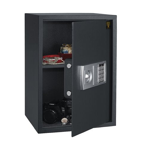 Details: If you are considering a new safe, look no further. We are pleased to Introduce the Quarter Master 7775 Safe by the Paragon Lock and Safe Co. Easily store and keep valuables safe at home or office with this digital safe; works with included key or your own customized digital code you program. For added security, we've made the hinges concealed so they're tamper-proof. It is perfect for the home, office, or work place. Full 10 year warranty! Features: Digital entry eliminates the need for making multiple key copies Easy to operate and program Larger and More Robust than the competition Includes 1 Interior Shelf. Counting the bottom, that makes 2 unique compartments Opens with secret PIN code or included keys (2 FREE KEYS) Simple programmable Electronic Lock with buzzer and LED. 3 to 8 numbers Runs on AA SIZE(1.5V) batteries (Included) Constructed with solid steel to resist hand and mechanical tool attacks Pre-drilled holes inside the safe with fixing bolts allowing anchoring. Powder coated interior and exterior Constructed of extra thick 11 gauge solid steel Grey carpet mat padding on inside bottom Anchor bolts are included Dimensions and Weight: External Dimensions:19 3/4" H x 14" W x 13" D li >< li > Internal Dimensions: 19" H x 13.5" W x 12" D Weight: 55 lbs Color: Dark Grey